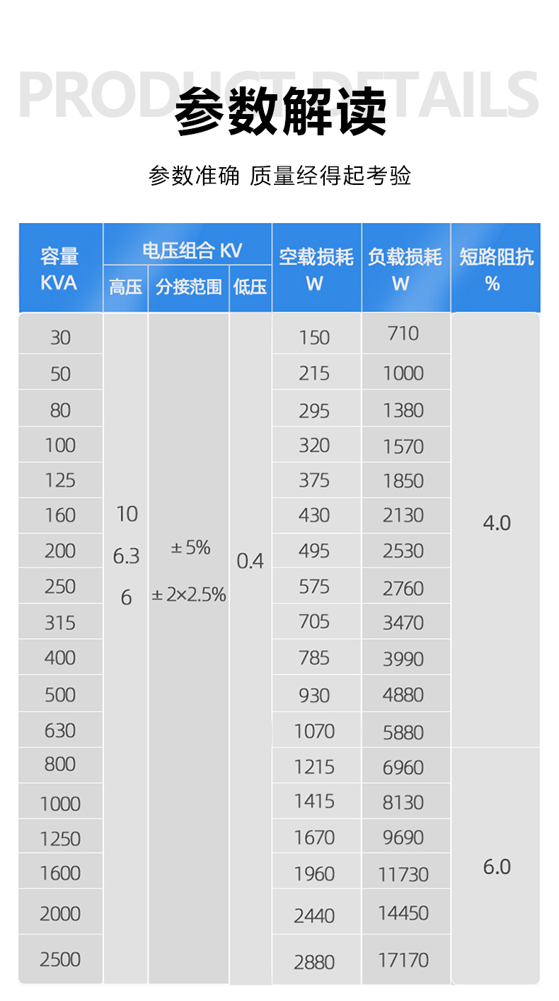 答 01全新硅鋼片噪音小,損耗低,運行穩定,壽命長02純銅線圈過載力強無氧銅線,穩定性更強,導電性能更好,抗短能力更強03浸水運行IP68防護等級,浸水運行穩定可靠04穩定可靠全密封,全絕緣的接線方式,高壓側帶熔斷保護...